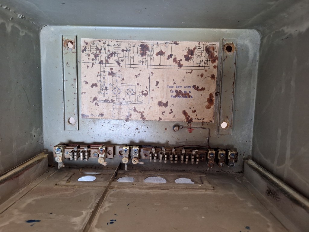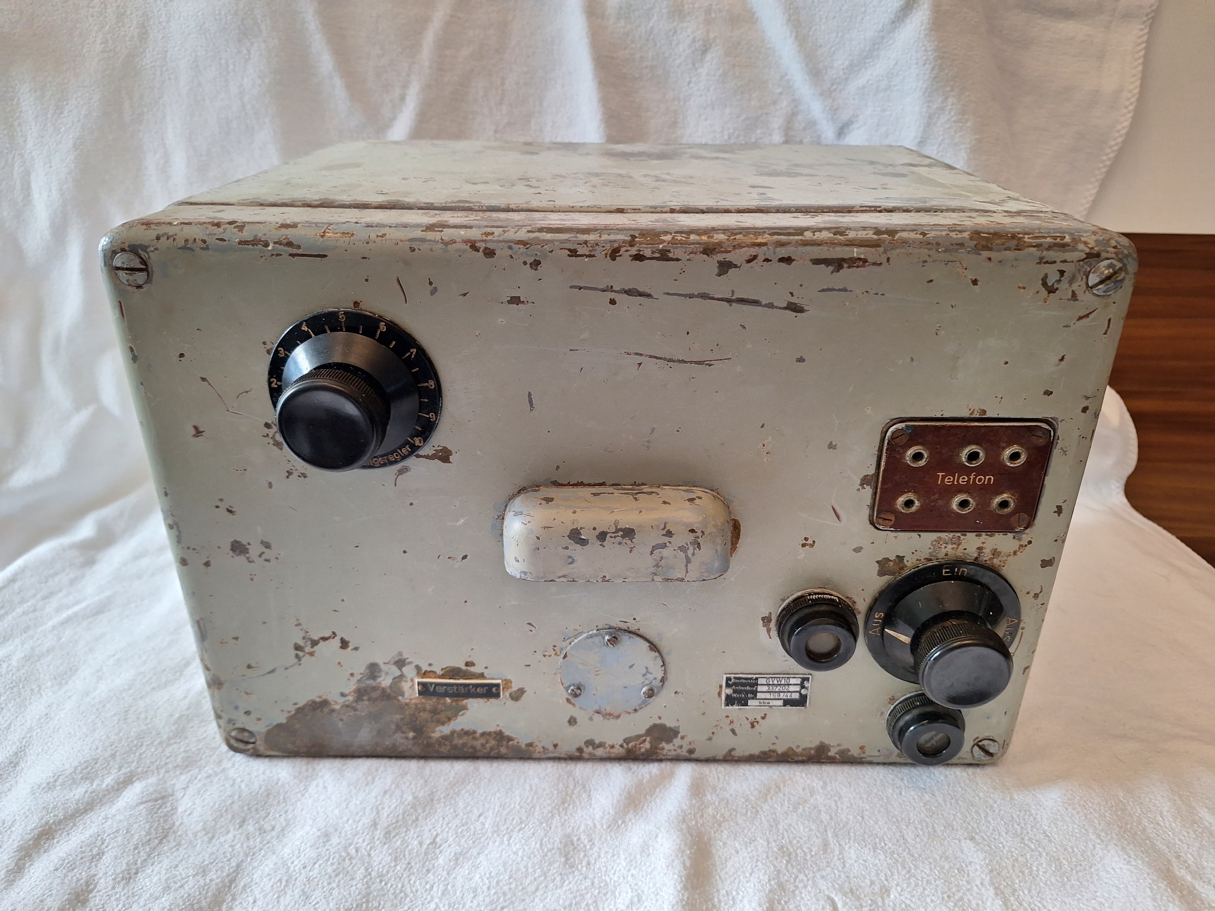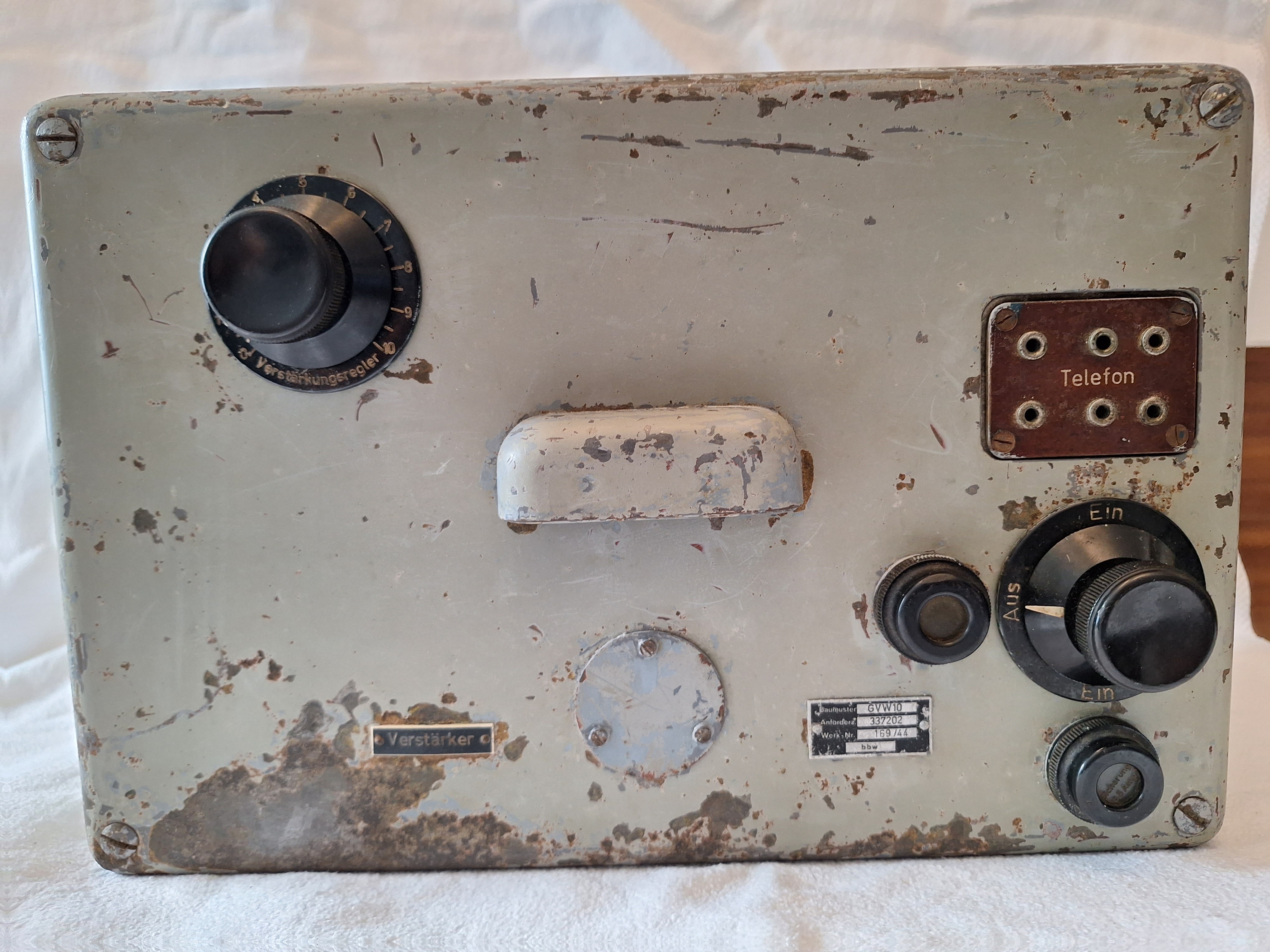 This is the GVW10 Amplifier made by ELAC Electroacustic Kiel. It is for the NHG Nah-horch-gerät. It was used on ships including U-Boats to have an early warning against Torpedos. It had permanently fixed Mikrophones in the hull of the ship on the left and right side.