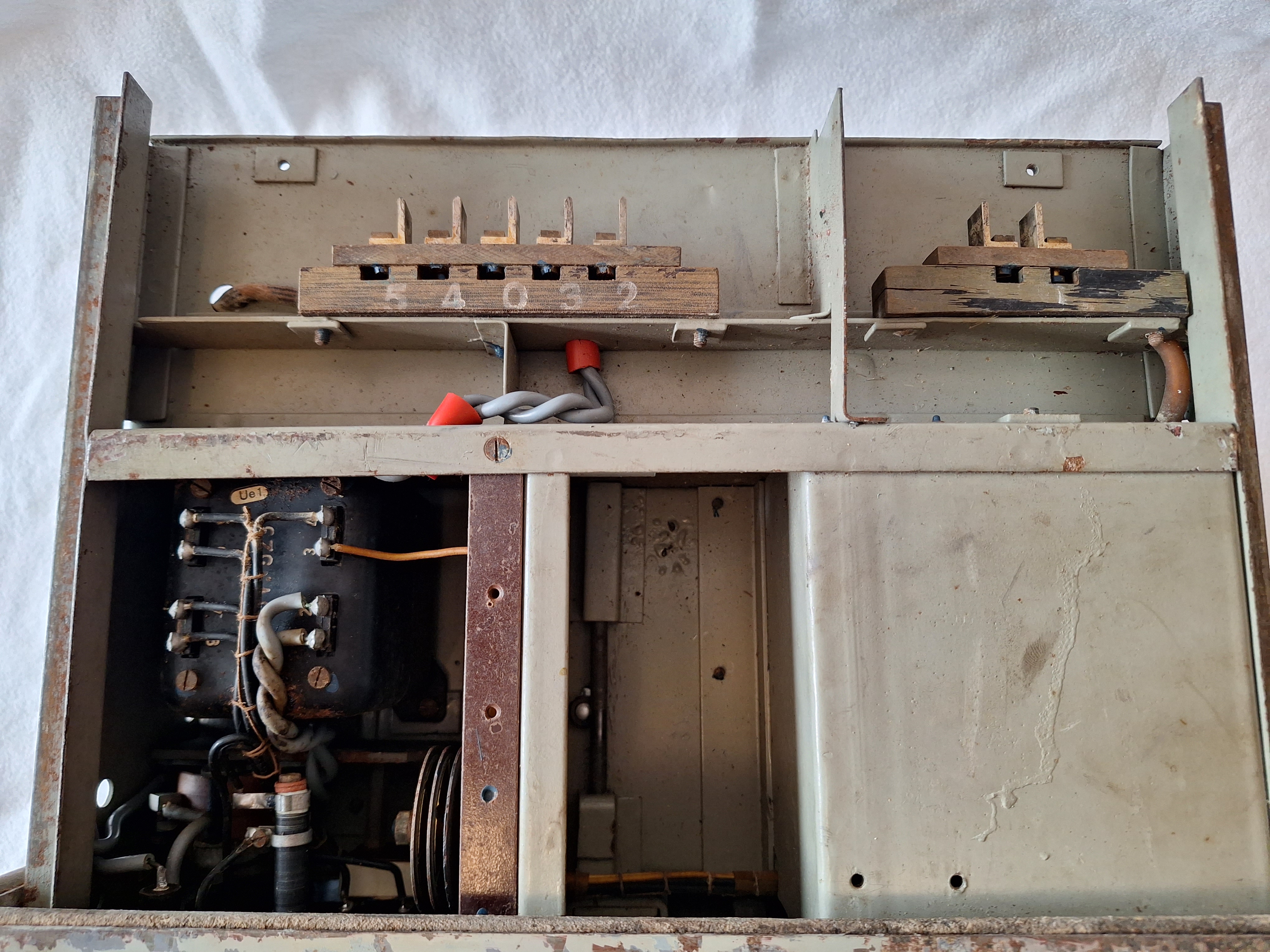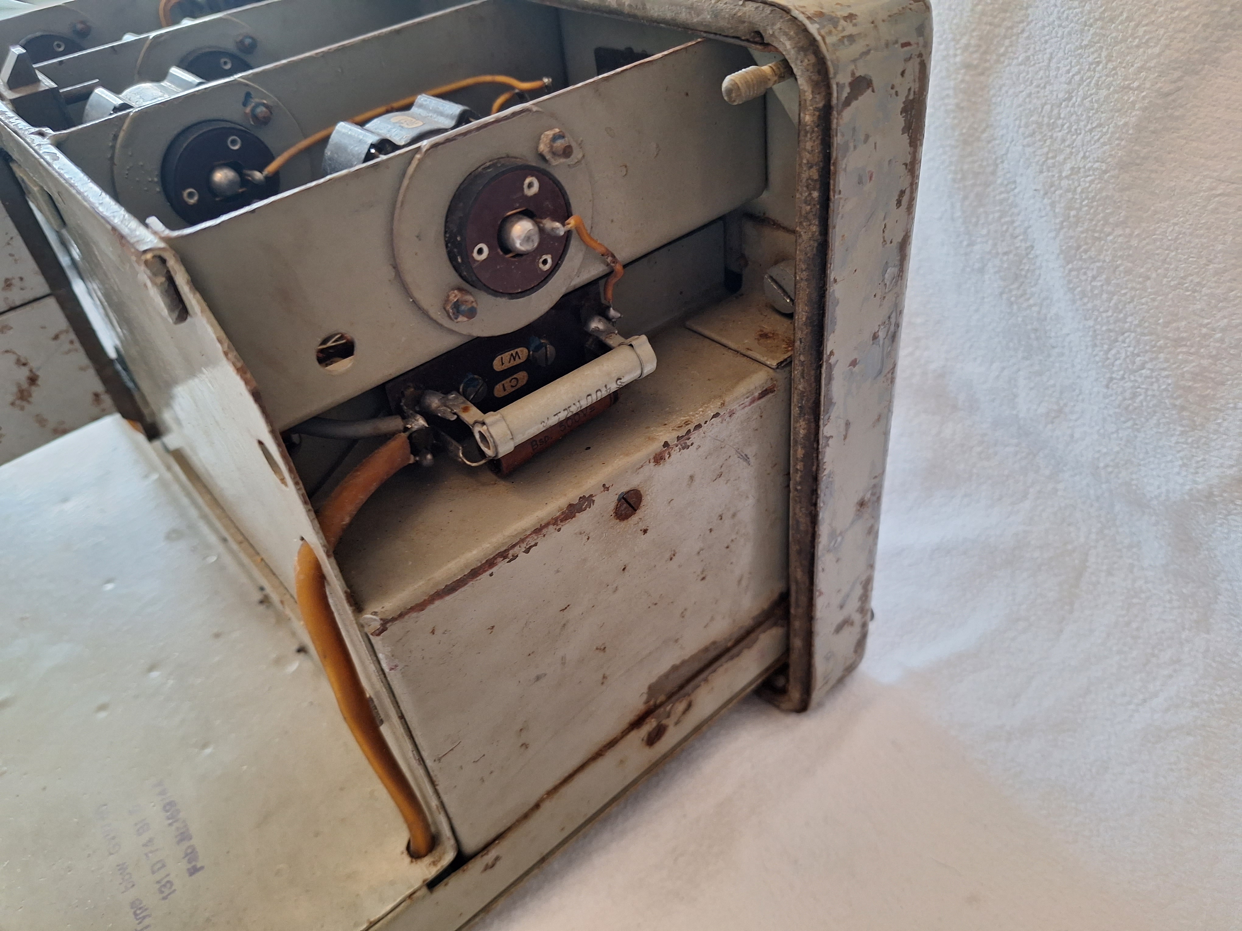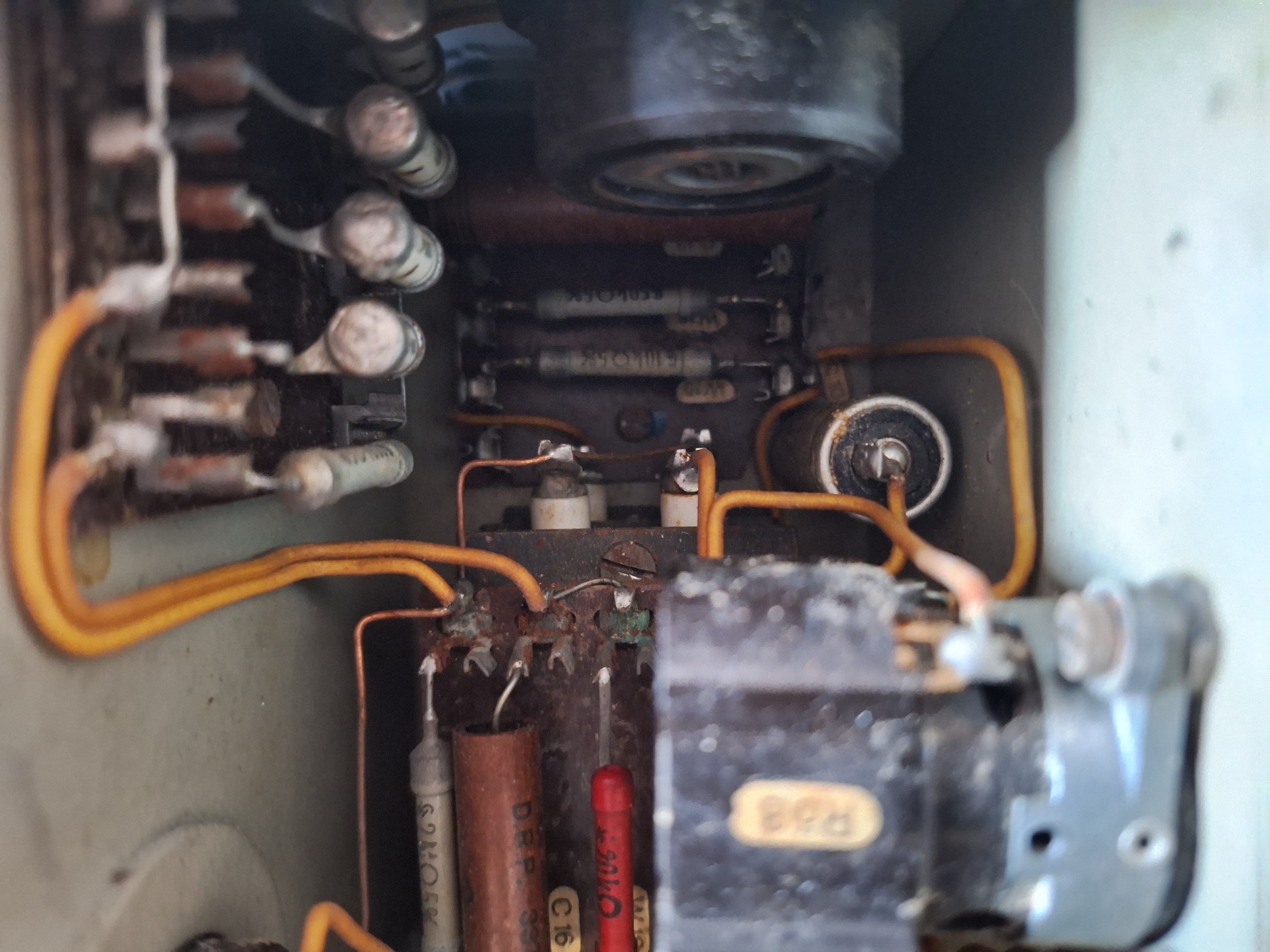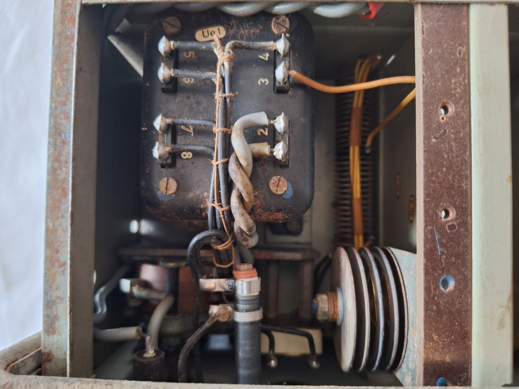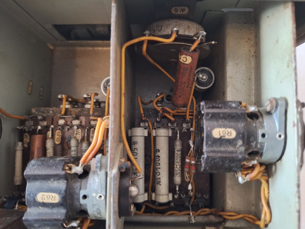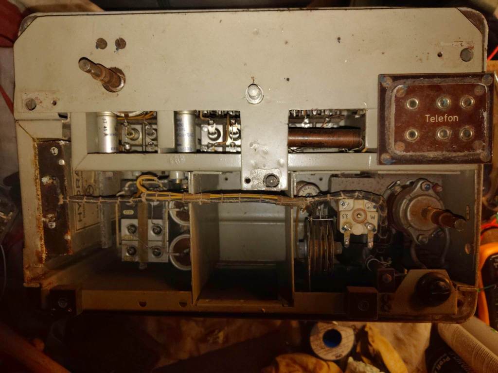 Visible on this picture is the Amplification control in from of a Potentiometer. Also two tubes are visible and every part is marked with its own number. A single post war repair can be seen in form of two resistors.