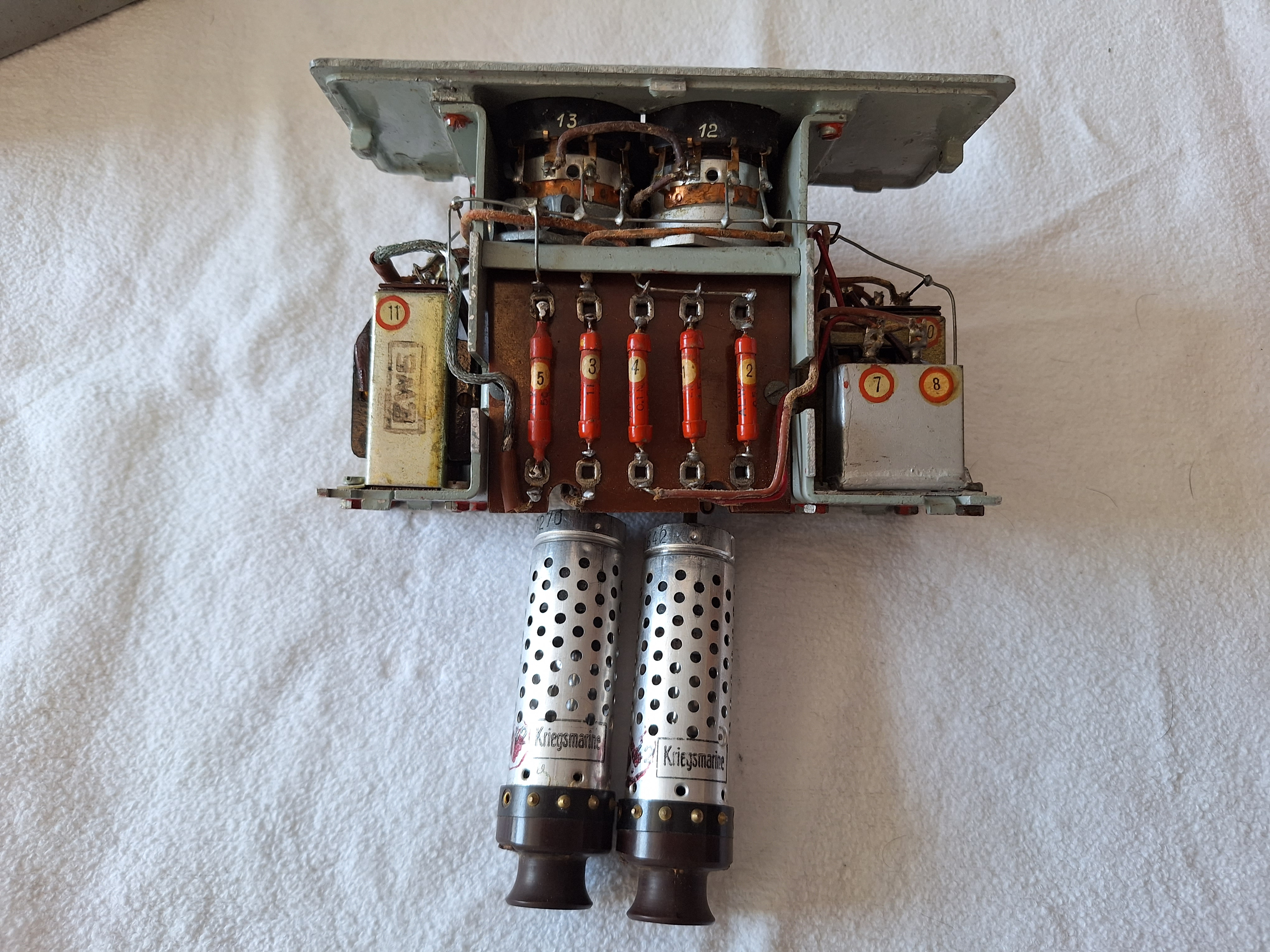 Here you can see the inside. The Amplifier uses two RV2p800 Tubes both marked Kriegsmarine and they are the original ones NEVER CHANGED. The construction is of a very high quality and every part is numbered.