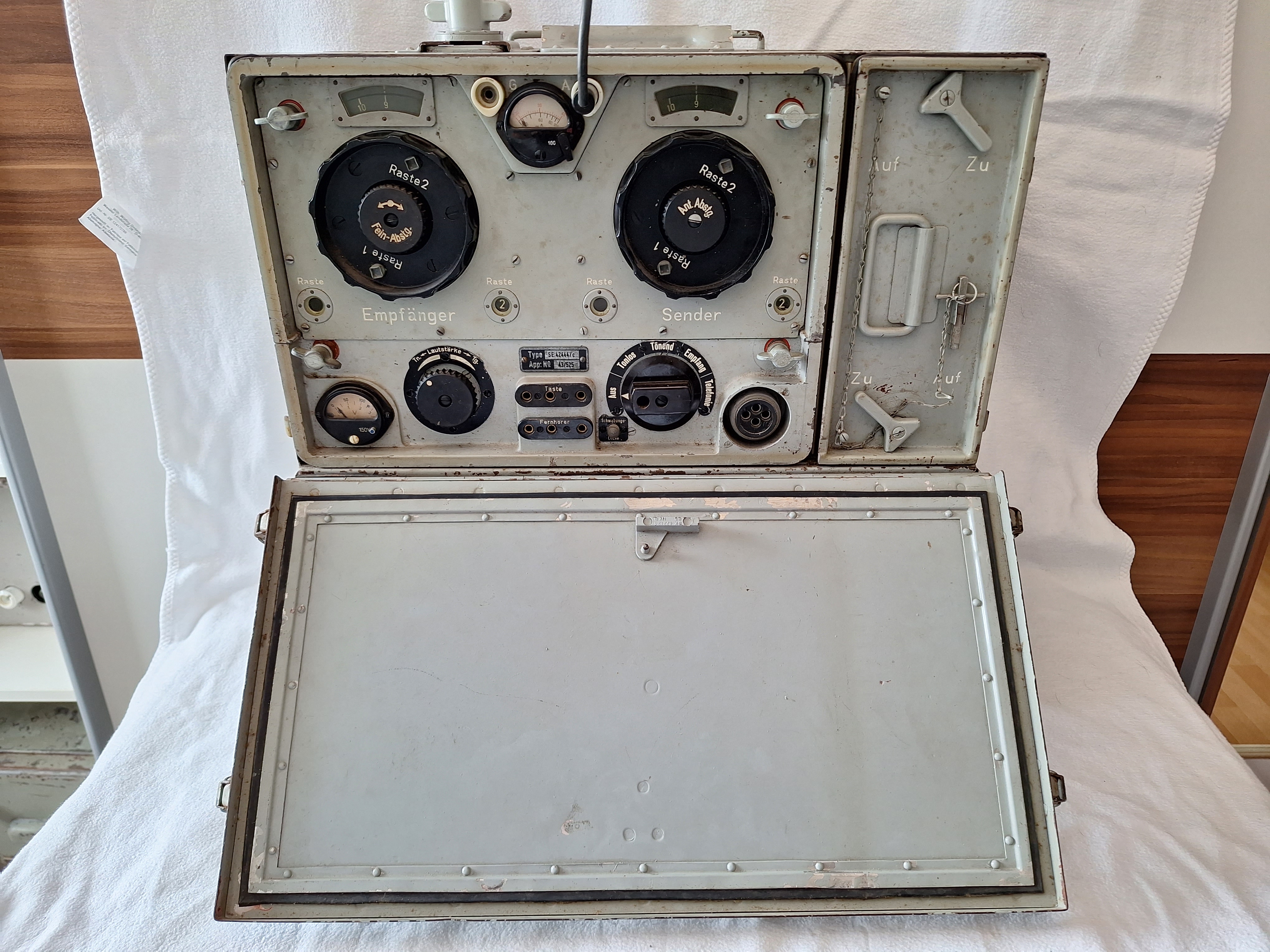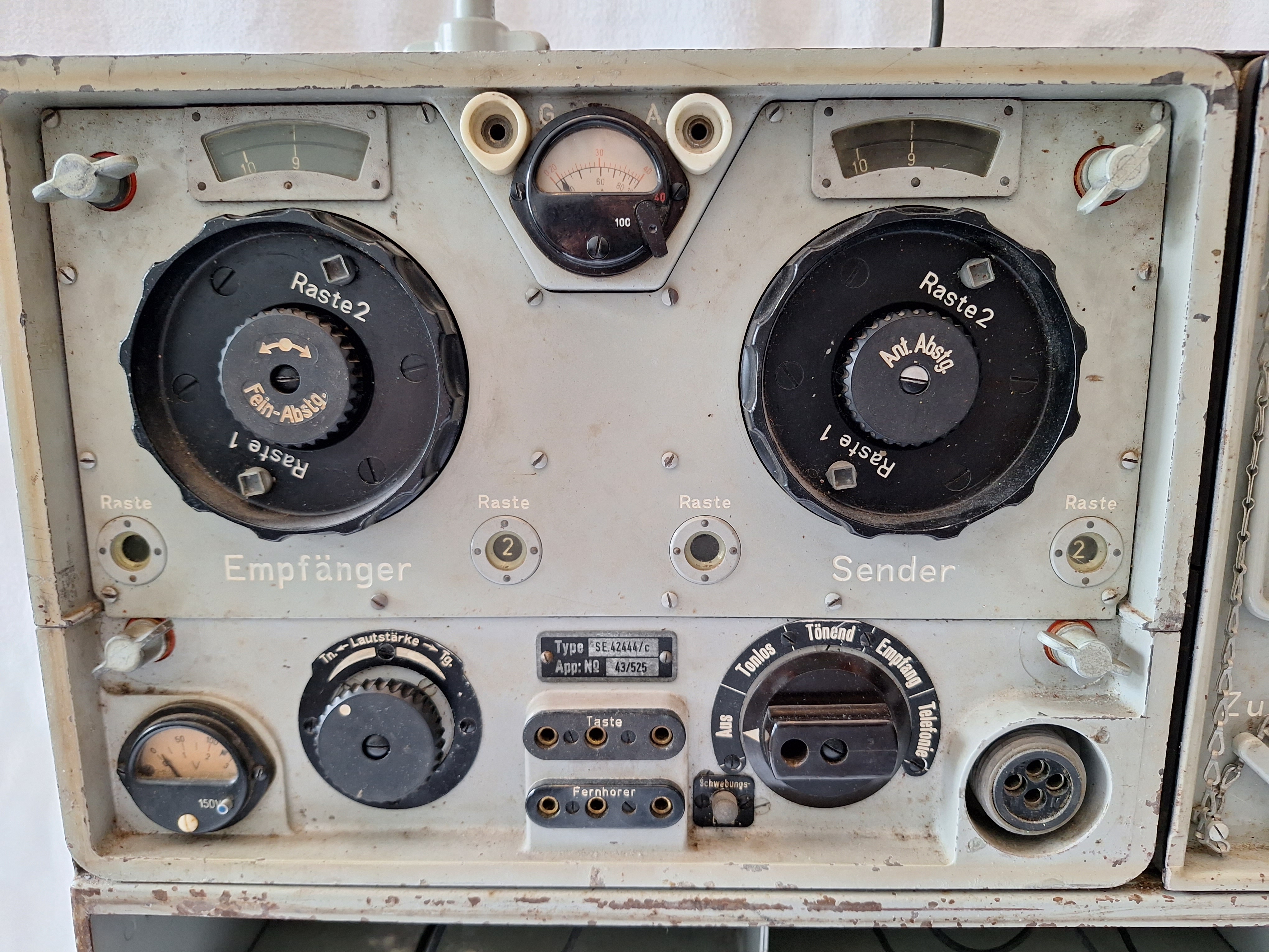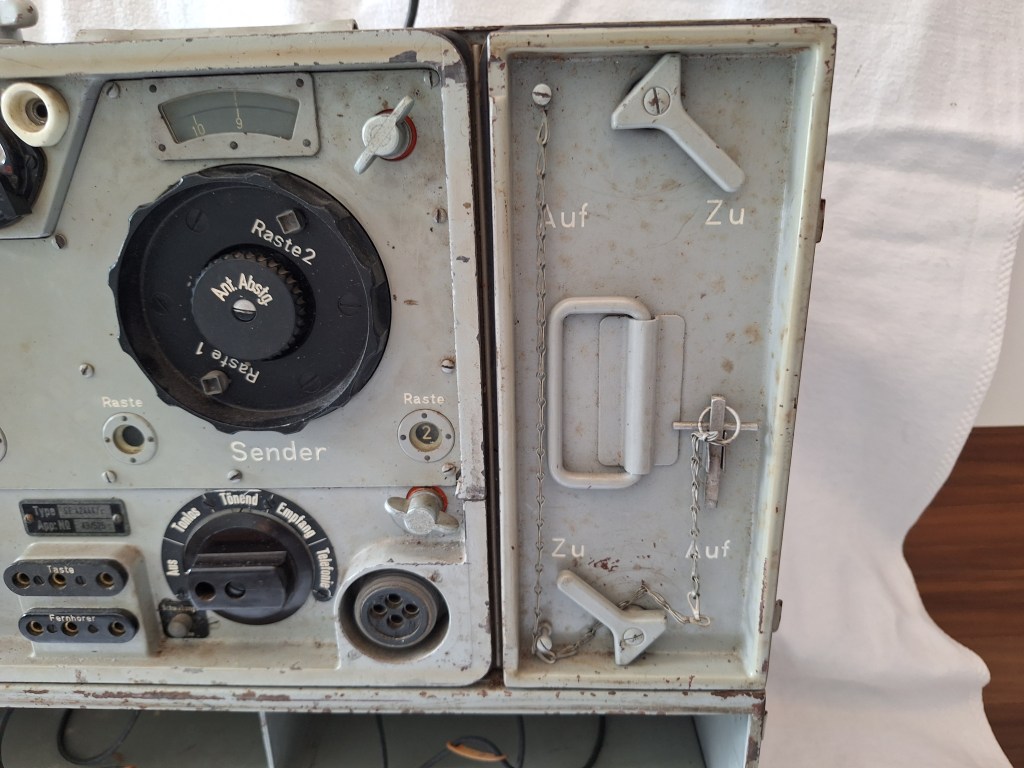 The Front the two big knobs are for frequency control and inside them is either a finde tuning know or a antenna fine tuner as the case for the Transmitter. below them to the left is the Tone control and to the right is the On/Off switch wich also switches different modes. Telegrafie, Telefonie and Empfang. A small button is also located at the bottom to tune both receiver and transmitter to the same frequency.