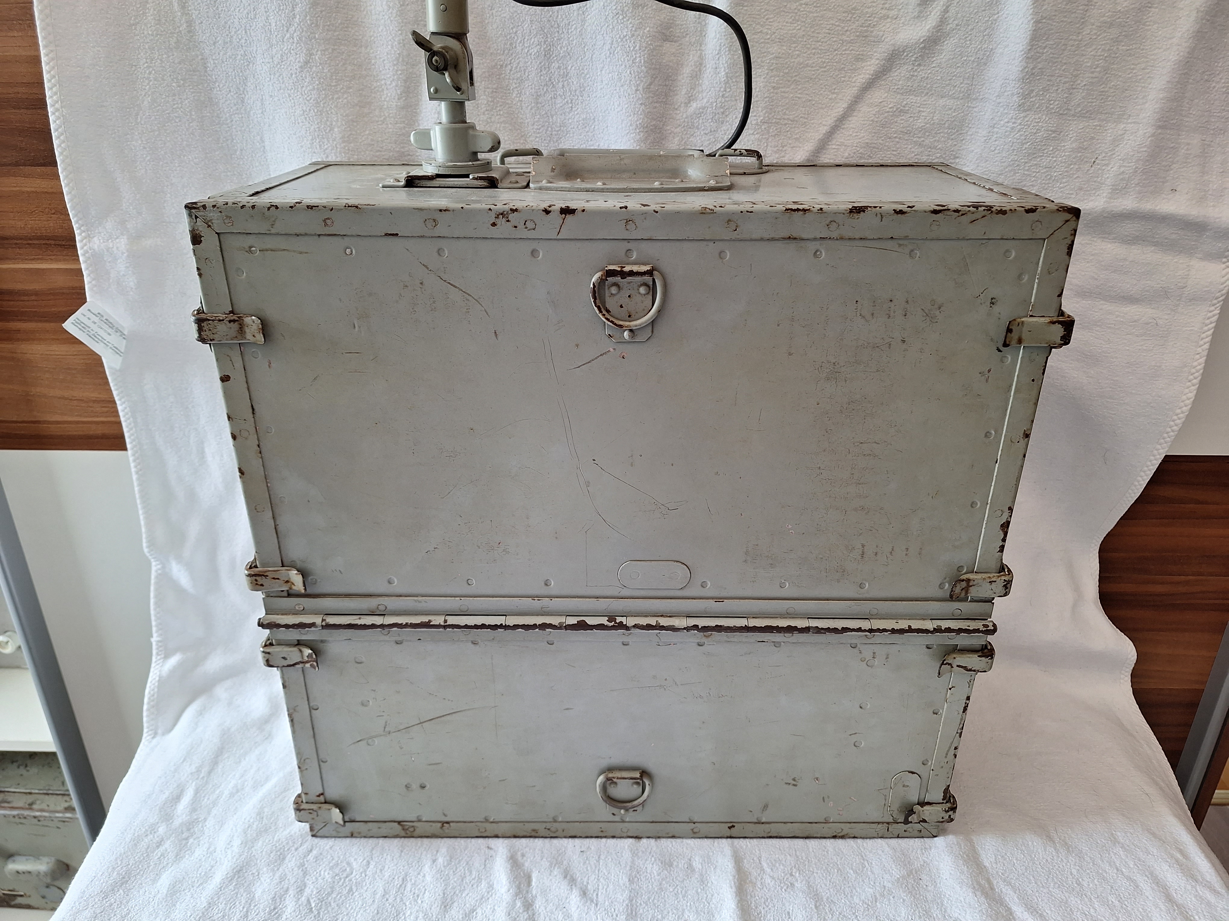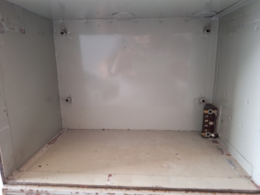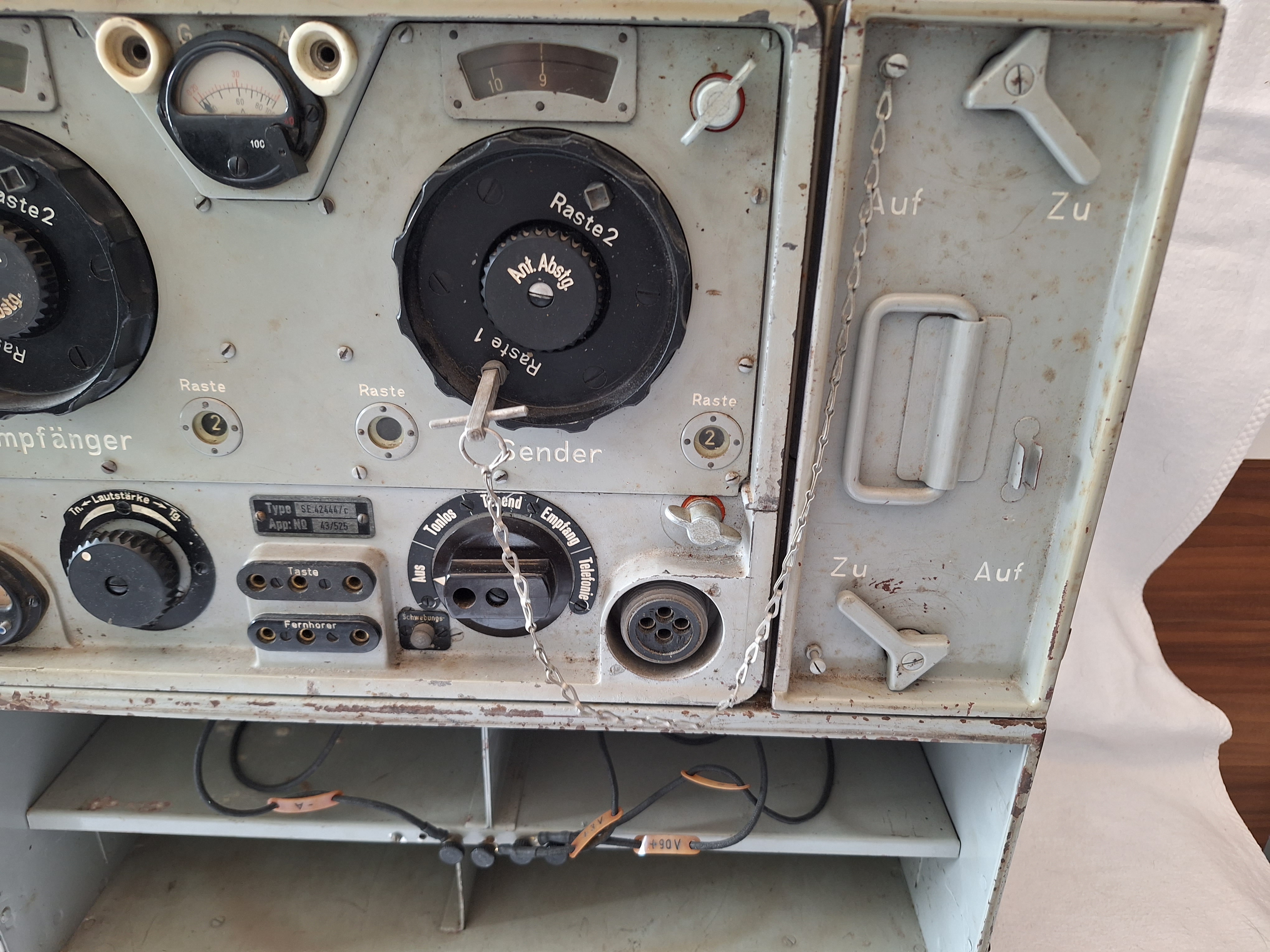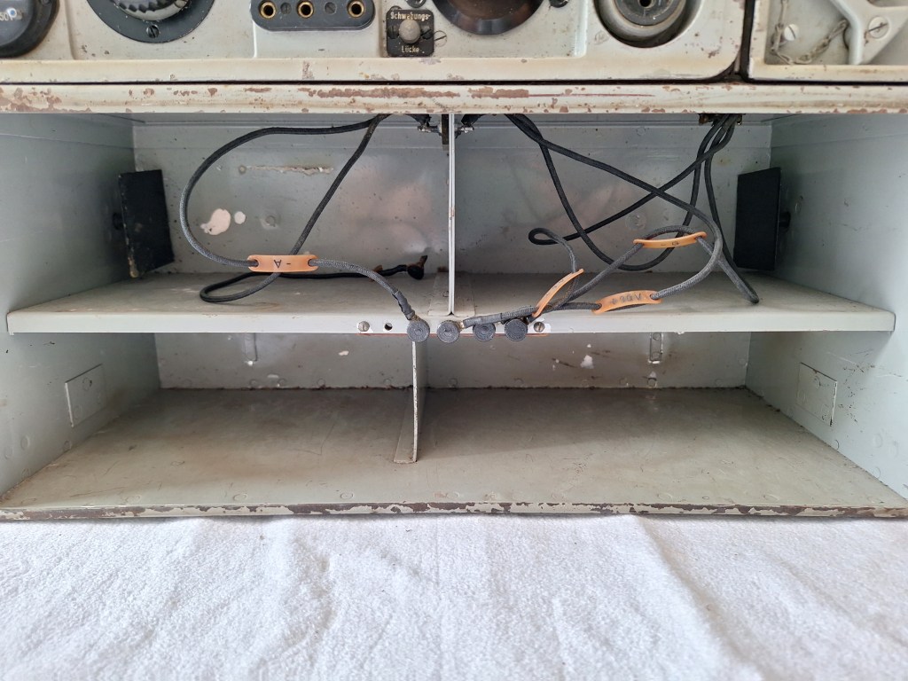 Below the battery compartment and its connection cables are two more storage spaces for a morse key and a kopffernsprecher.