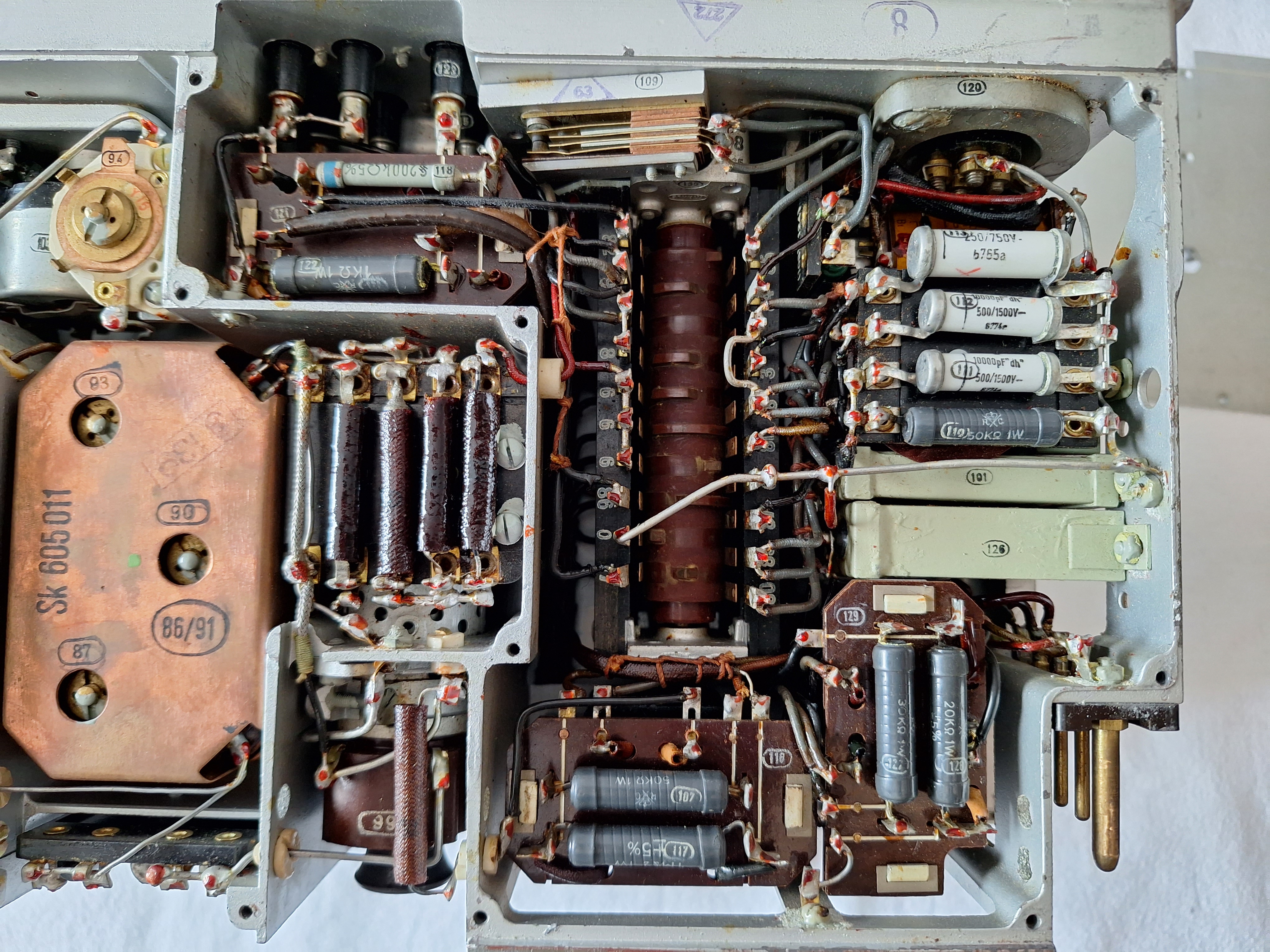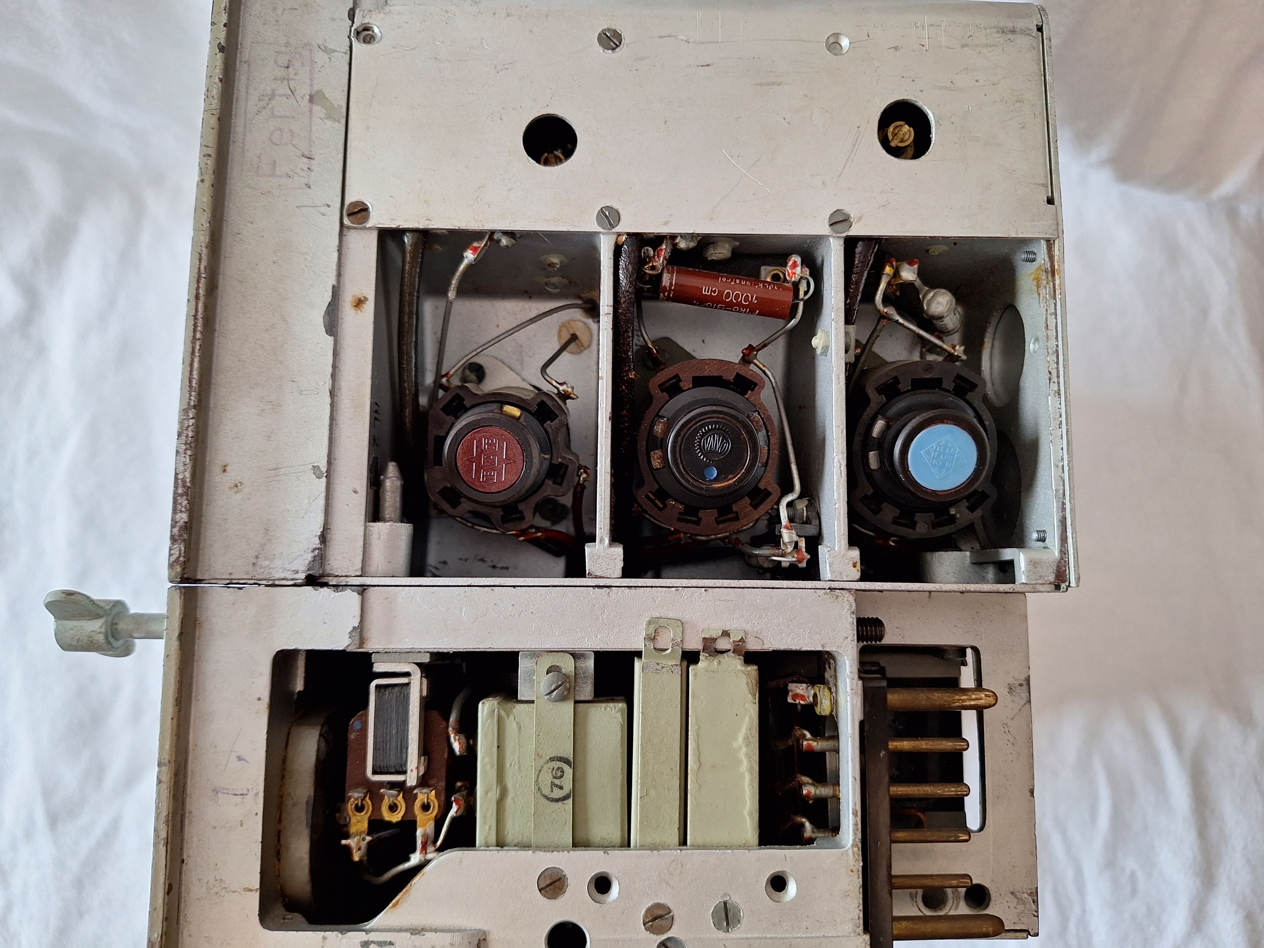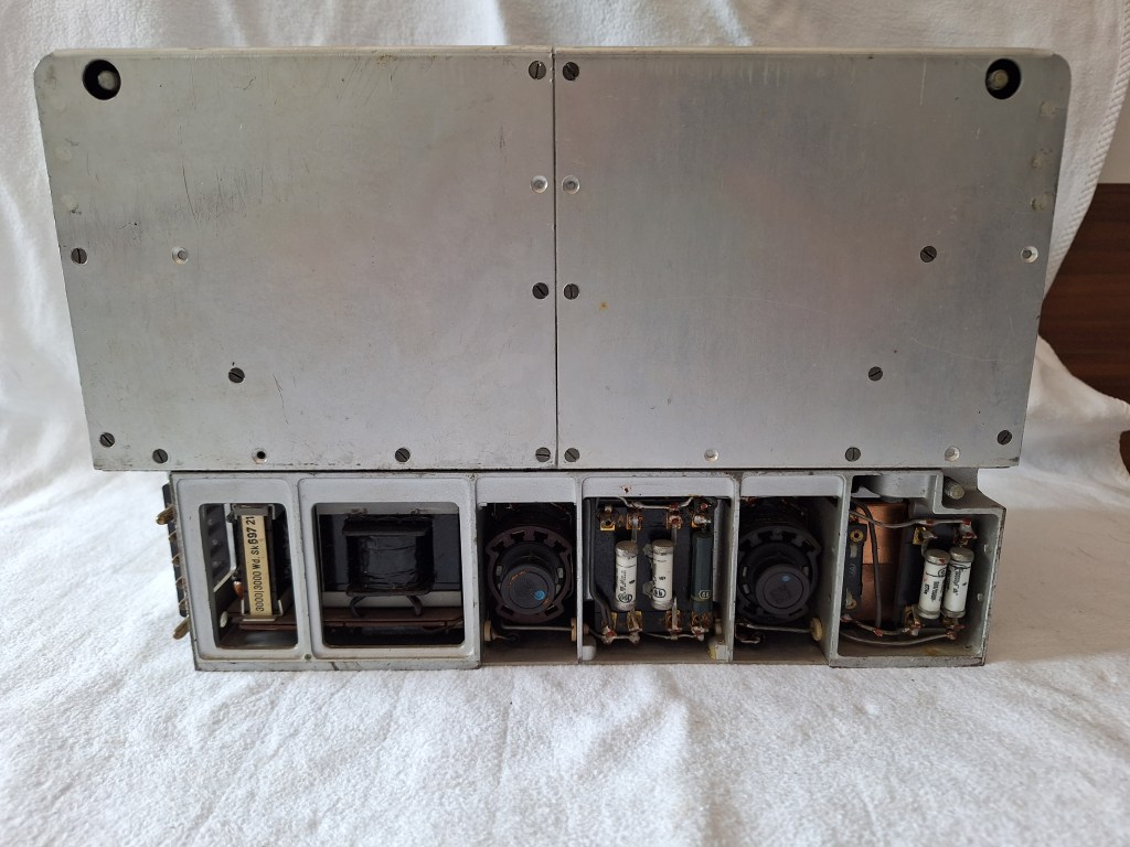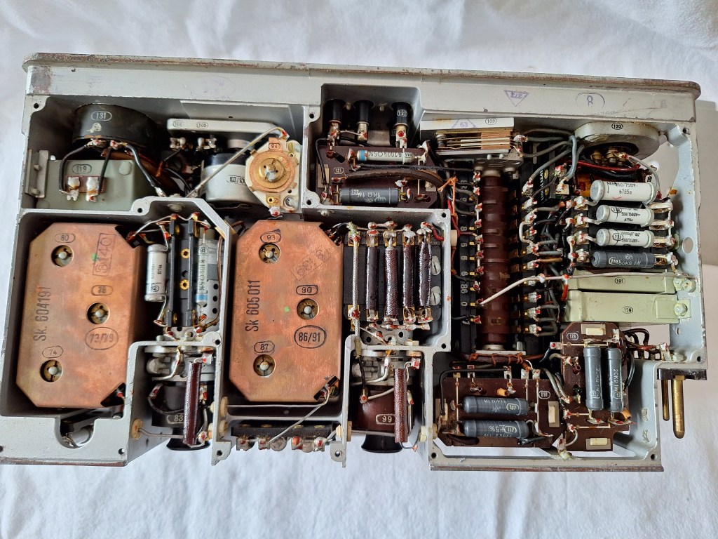 When the cover is removed some beautiful parts reveal them self. The copper looking things are the IF stage. The copper shields them. The big ON/OFF switch is also visible.
