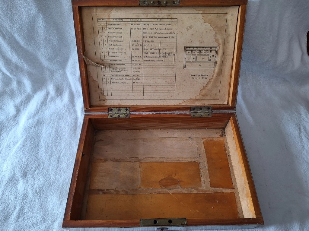 The box is sadly empty and missing the dividers. It would have included a loot of parts like Voltmeter Capacitors Resistors Antenna segments and a loot more.