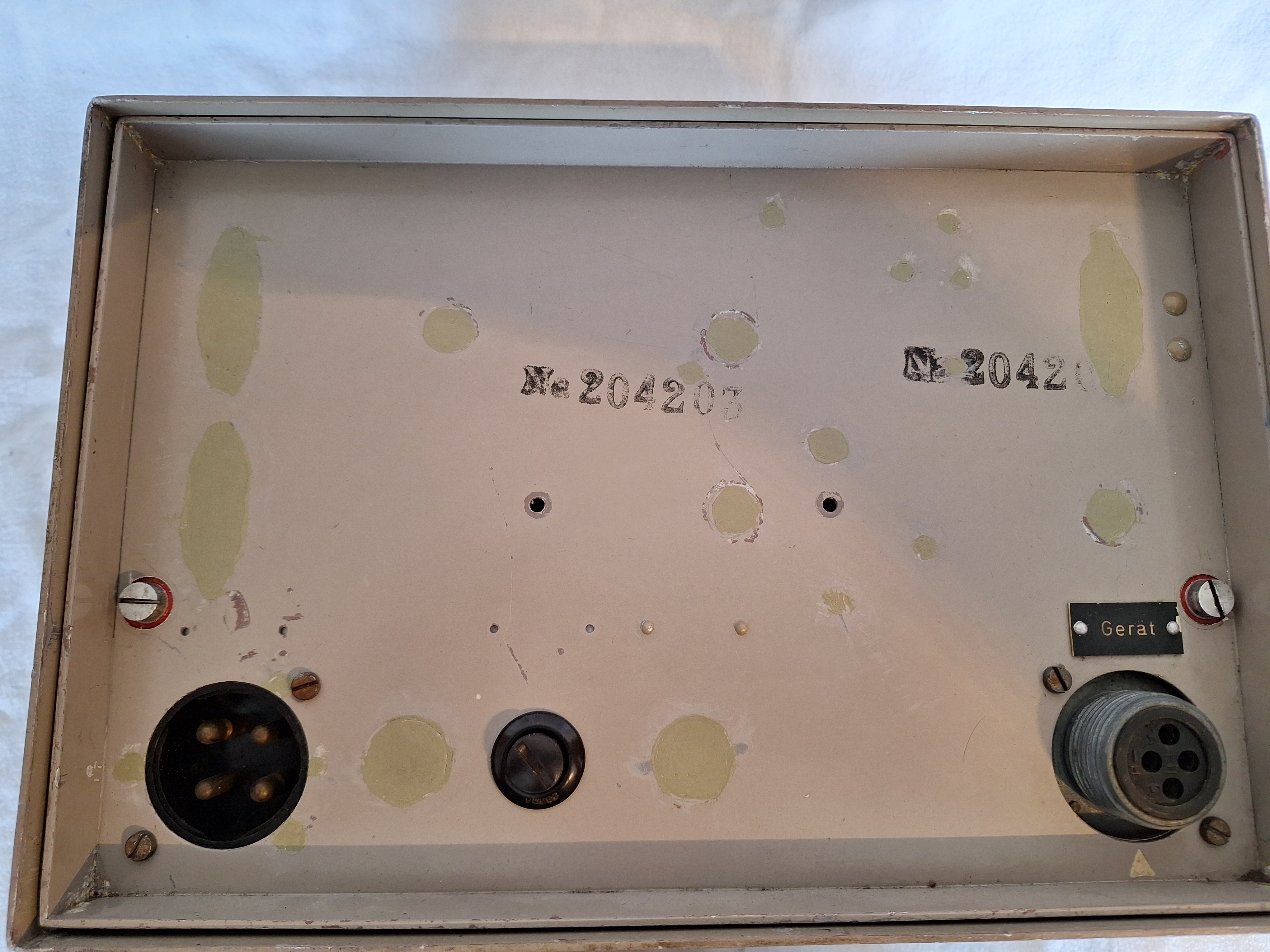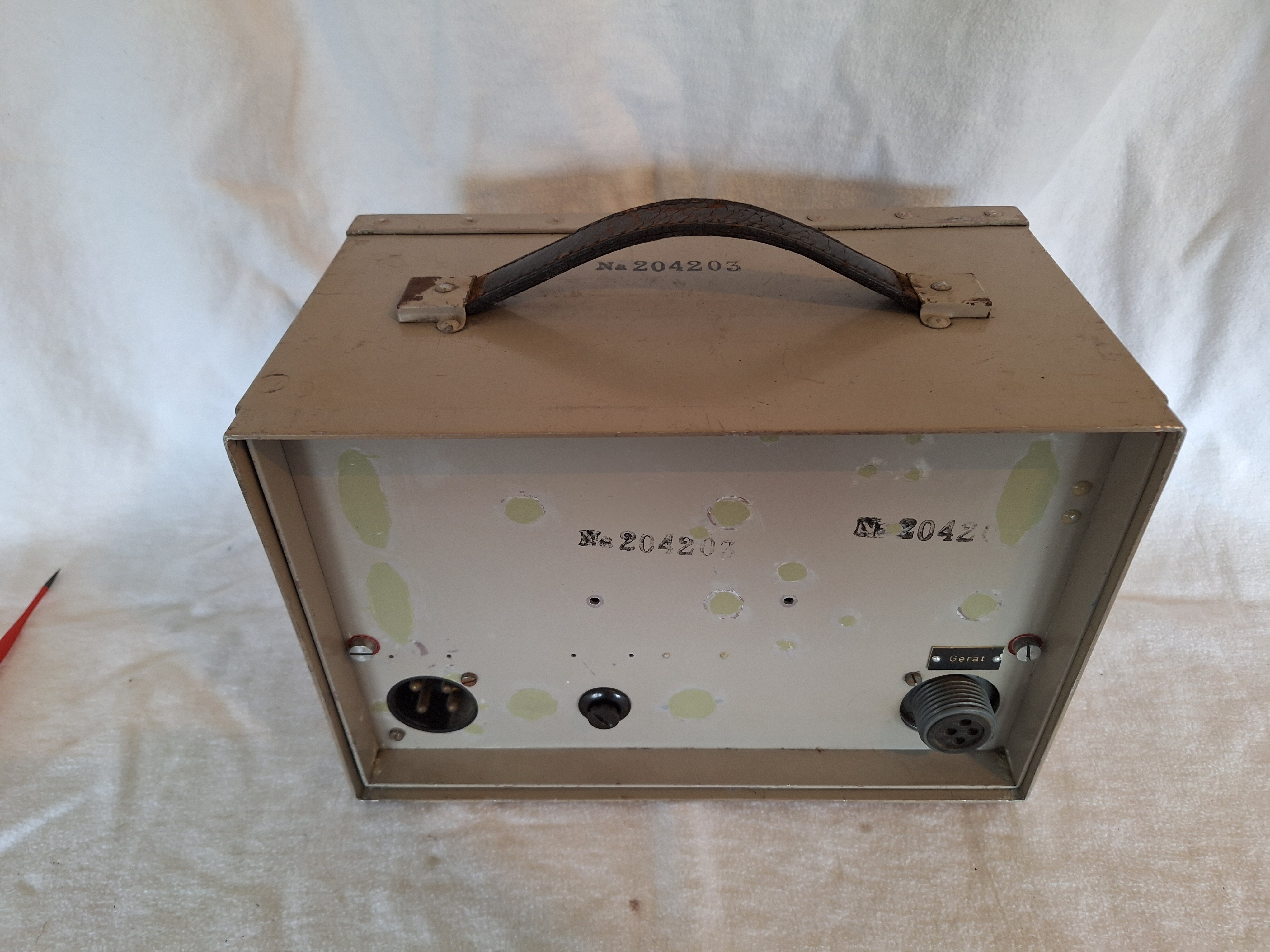 Sadly visible is that this power supply was heavily modified post war. I have closed the extra holes but have not found a good paint to cover it up. Both connectors visible were not present when I received it so I added them. They fit perfectly. missing is the type plate, instruction plates and the handle in the middle.