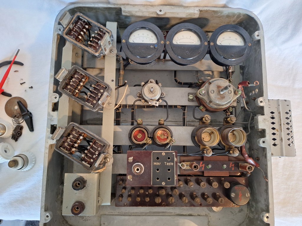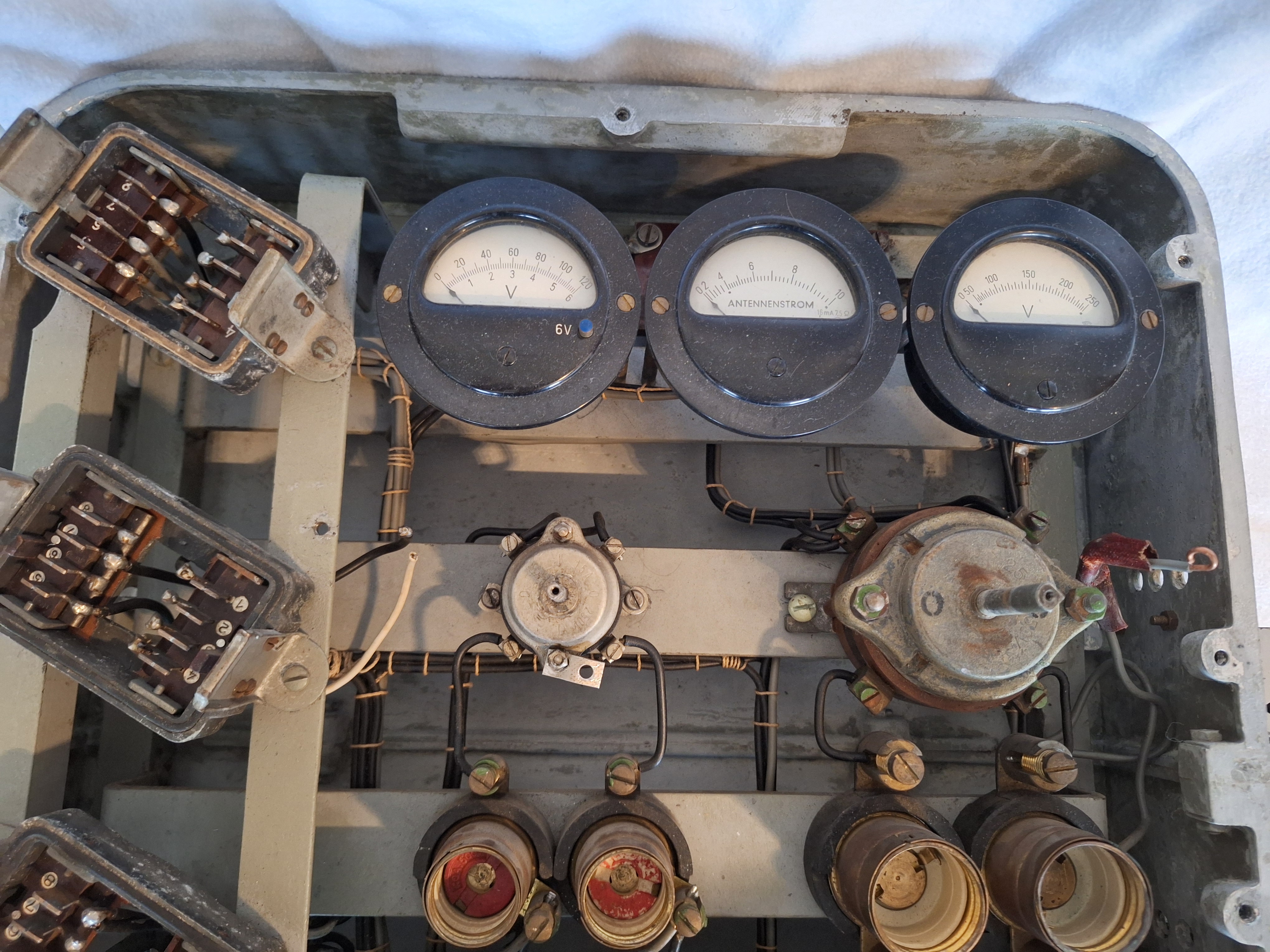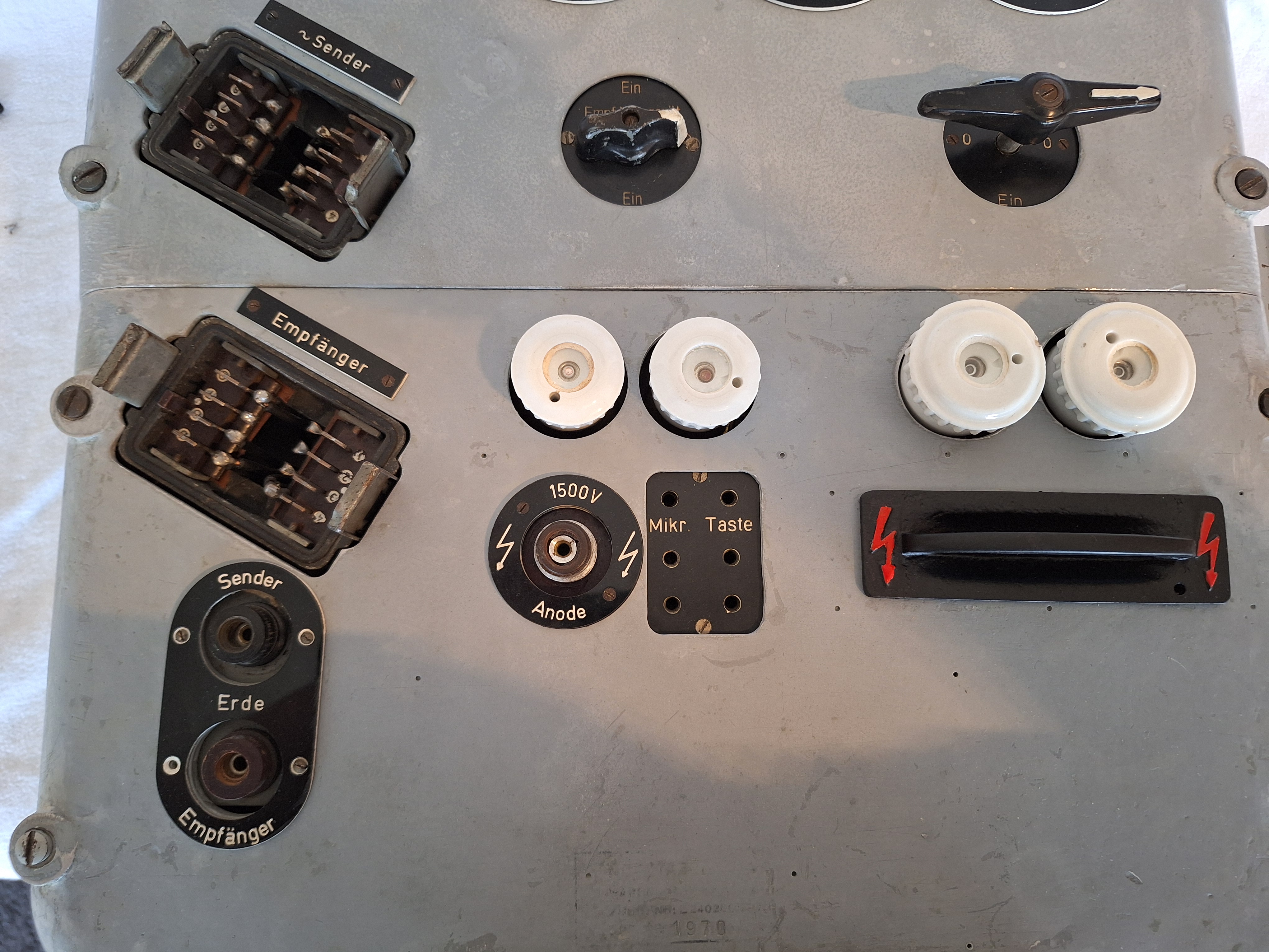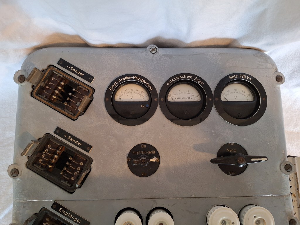 This is the 220VAC Netzschalttafel for the Telefunken 40/70 Watt transmitter and receiver. The Receiver and Transmitter are connected directly to this. It houses the fuses for the Mains supply and some other Voltages like the High-voltage 1500V for the Anode. It also houses Voltmeters and the Antenna-meter for the Transmitter as well as the sockets for the Morse key and the Mikrophone.