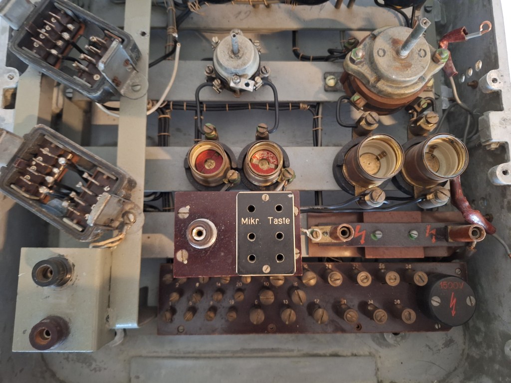 Here visible is the connector for the Receiver. These are often seen on Luftwaffe Equipment but also by the Kriegsmarine. I do not know who used them first. On the bottom left are the connectors for the earth of the Receiver and Transmitter. Next to it the connector for the Anode Voltage and the connector for the the Morse-key. On the right the black cover hides the Anode Voltage fuse.