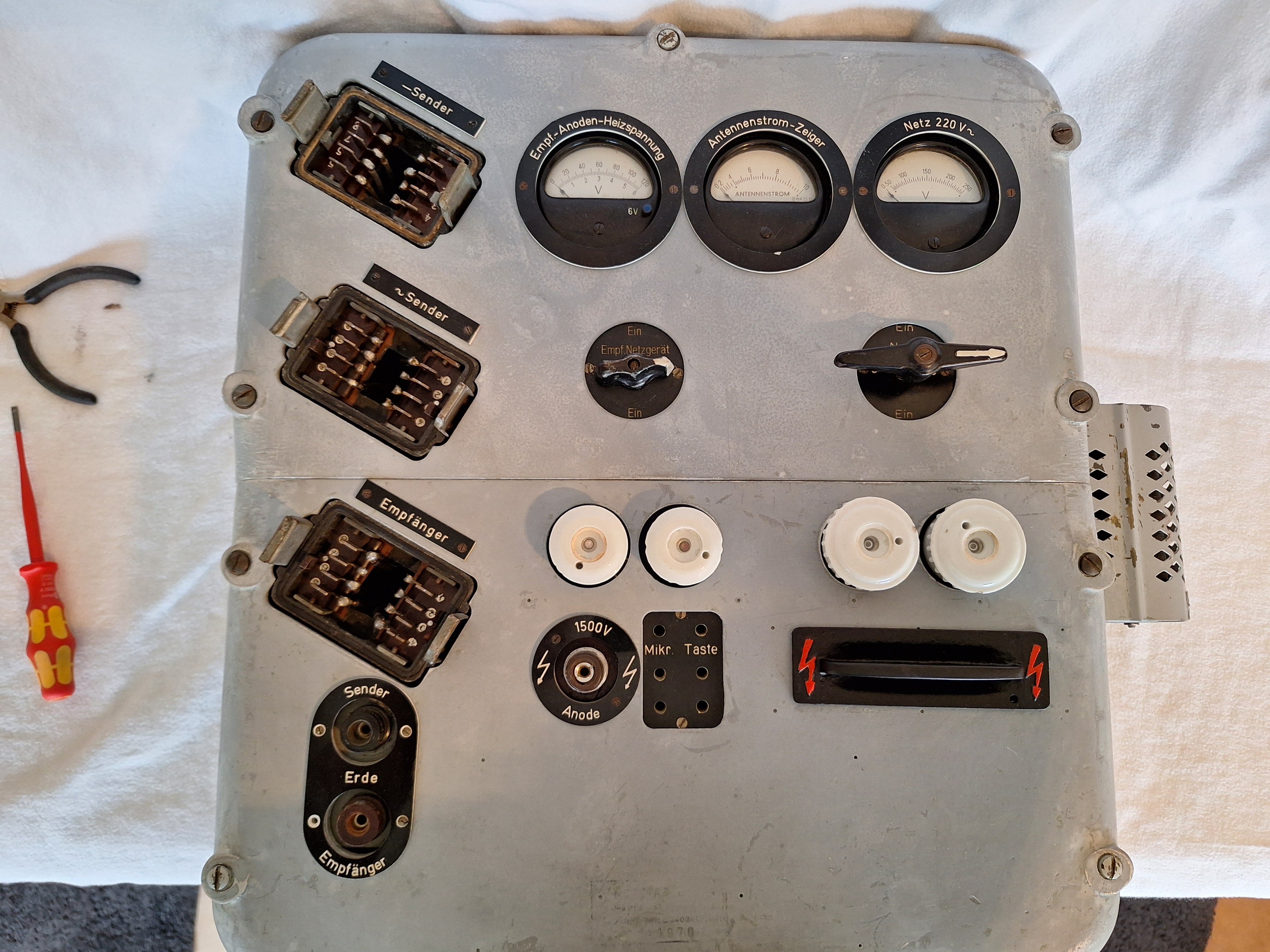 On the left side top to bottom the two connectors for the Transmitter and below it barely visible the one for the Receiver. To the right side the 3 Meters. The first is for the heater and anode voltage of the receiver. Next to it the one for the Antenna current and the last one is for the Mains voltage 220V. The bigger switch is for the Mains Voltage the one next to it is for the Receiver.
