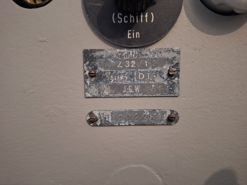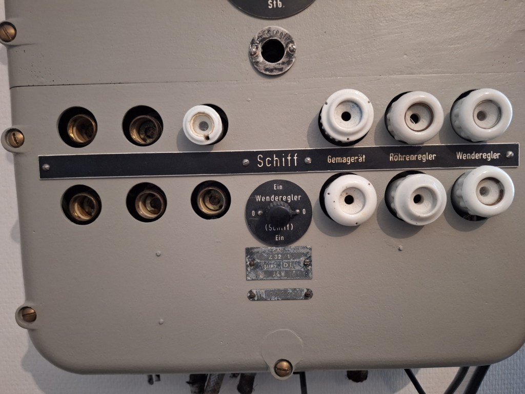 Here all the Fuses are situated. Interesting is that the left side of fuses are not mentioned I believe these were not used when this installation was used on a ship. Also visible is the switch for the Wenderegler and the type plate below it.