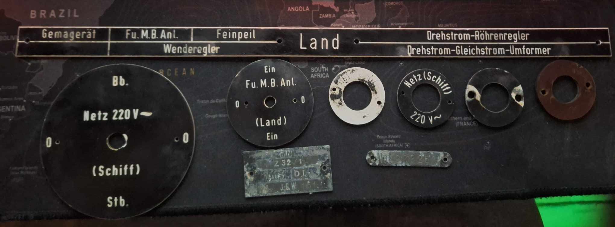 On top are 3 indicator lights and another one below the main switch. I believe one of these might have been added post war but because I am not certain I have left it like it was for now. The big main switch in the middle is for the Main power 220VAC and is switchable between two different generators. What is special about it is that these information plates can be turned around and have writing for a Bunker on the back site the last picture will show this in detail.